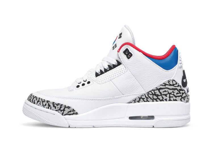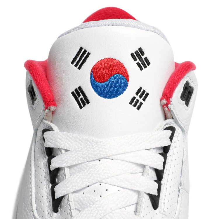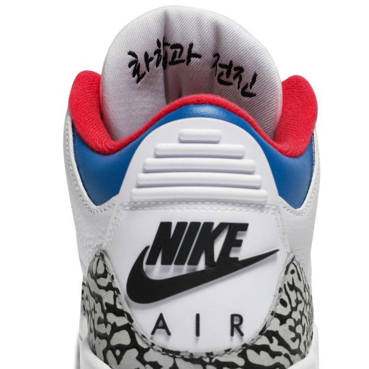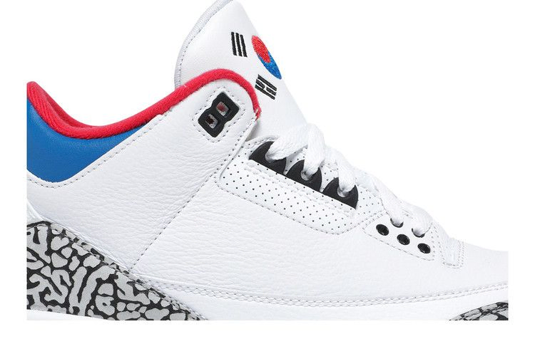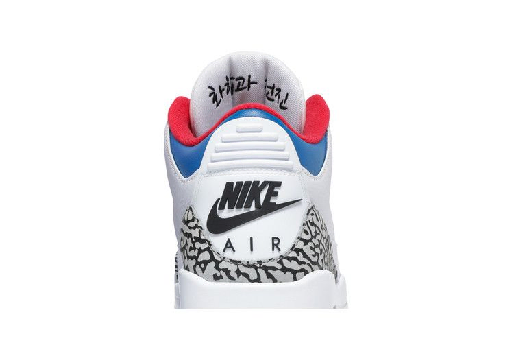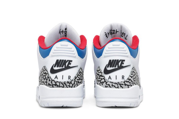 Модель Wmns Air Jordan 3 Retro NRG 'Seoul' посвящена летним Олимпийским играм 1988 года. Вдохновленные флагом Южной Кореи, эти AJ3 имеют черные, красные и синие акценты на внутренней подкладке и воротнике. На внутренней стороне каждого язычка изображены корейские иероглифы: с одной стороны - "서울" (Сеул), с другой - девиз игр 1988 года "화합과 전진" (Гармония и прогресс). Верх из белой кожи с эффектом галтовки украшен серым слоновьим принтом на носке и пятке, а классическая подошва и стелька AJ3 завершают образ.