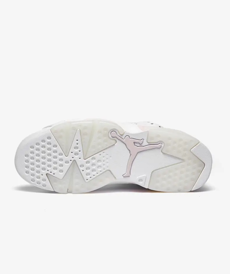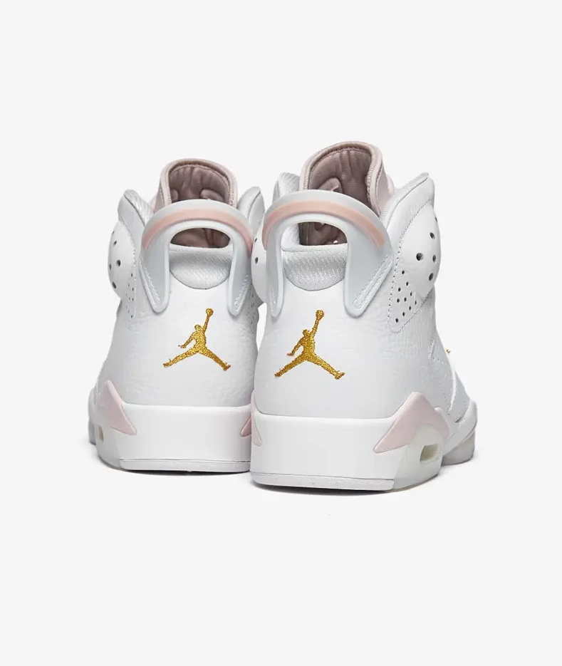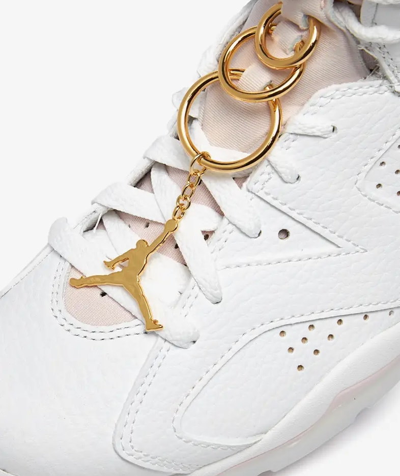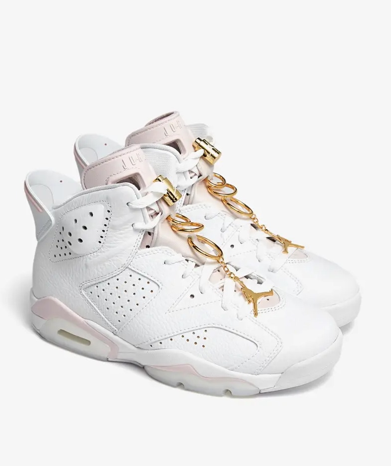 Женские кроссовки Air Jordan 6 Retro 'Gold Hoops' добавляют позолоченные акценты к обуви, которую носил Майкл Джордан, когда он выигрывал свой первый чемпионский титул в НБА. Винтажная обувь с белым кожаным верхом с вставками Barely Rose на язычке, пятке и мидсоли, а также видимой вставкой Air-sole на пятке. Металлические золотые кружевные замки сочетаются с тремя золотыми обручами, напоминающими серьги, с подвеской Jumpman, прикрепленной к нижнему кольцу с помощью короткой золотой цепочки. На подошве используется молочная полупрозрачная резина.- Цвета: White/Sail/Metallic Gold/Barely Rose