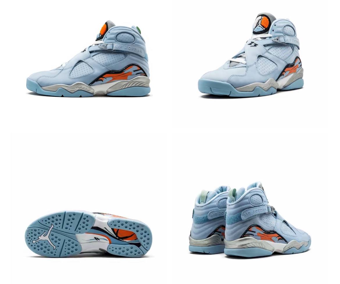 В этой версии женских Air Jordan 8 "Ice Blue" верх кроссовок из перфорированного нубука, система ремешков и подошва окрашены в холодный синий оттенок. Другие фирменные детали включают хромированные перекрестные ремешки, серебристую мидсоль, оранжево-черный логотип на язычке из синели, а также оранжевые и синие полосы на пятке.