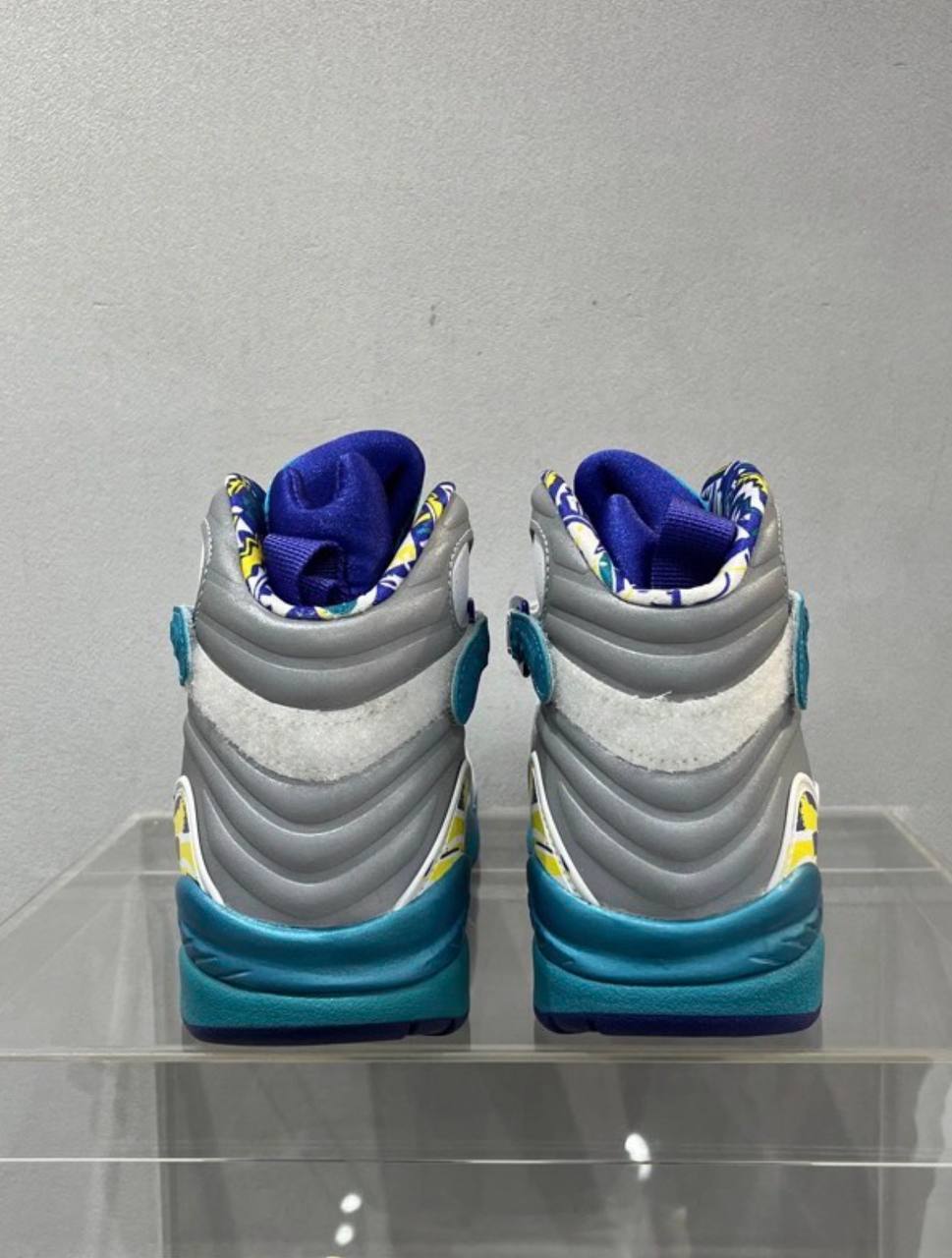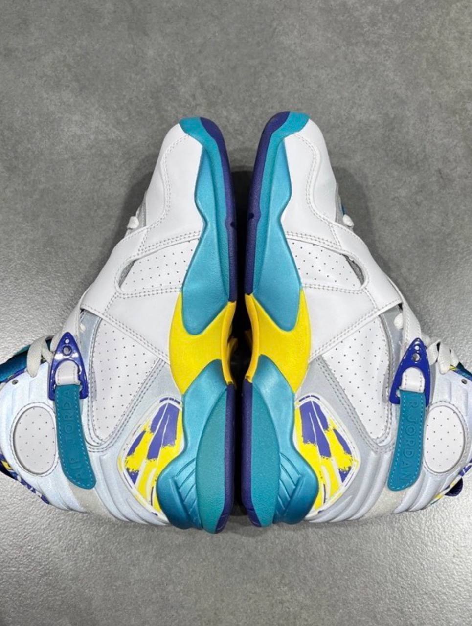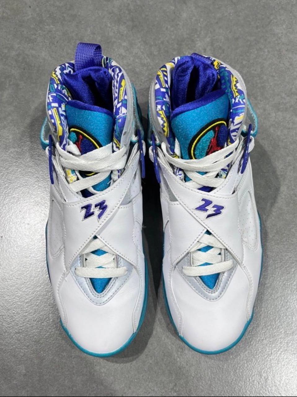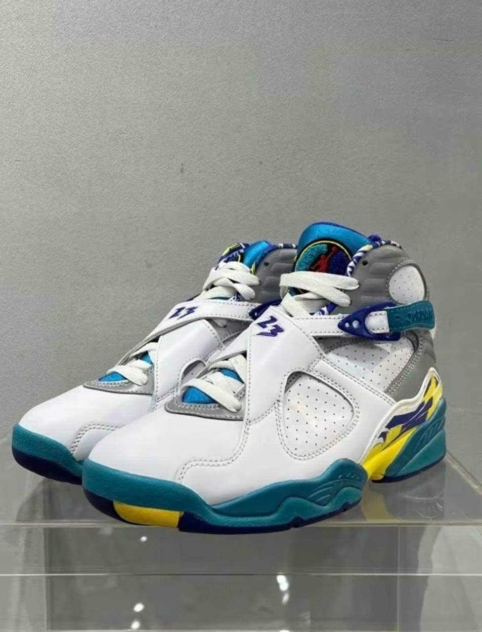 Кроссовки Wmns Air Jordan 8 Retro, первоначально выпущенные в 2007 году, возвращаются в новой форме в июле 2019 года. Это издание "White Aqua" предназначено исключительно для женщин и выполнено преимущественно из белой кожи с разноцветными акцентами и узорами. Язычок из синели с логотипом Varsity Red Jumpman отсылает к оригинальному дизайну, а "23" - номер джерси Эм Джея - вытиснен на ремешках, что усиливает колоритный дизайн.