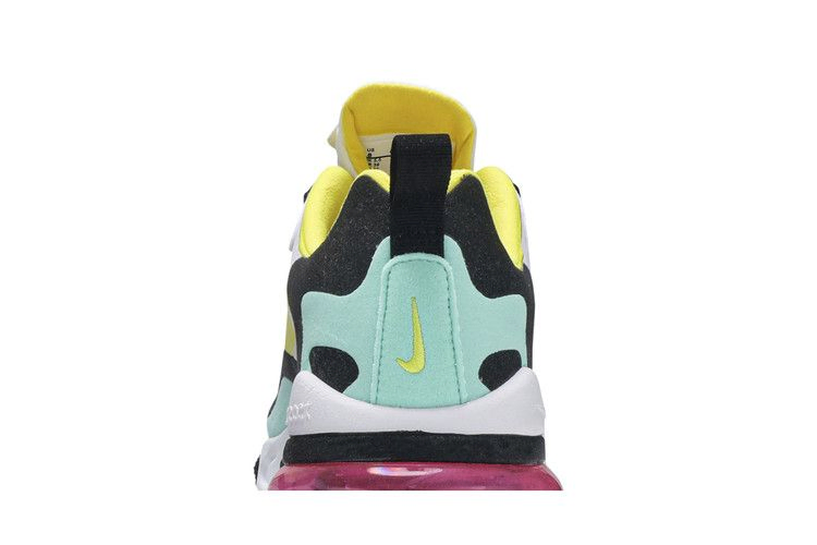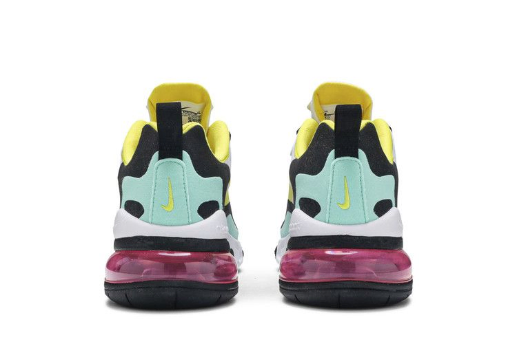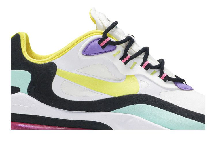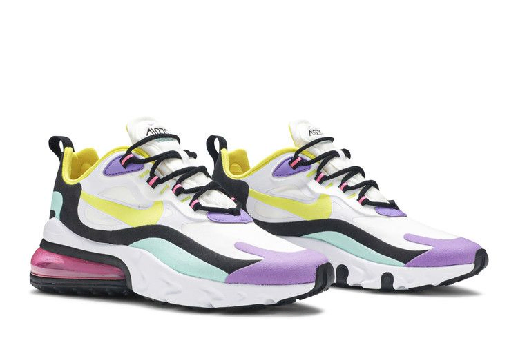 Nike Wmns Air Max 270 React соединяет прошлое и настоящее благодаря двойным технологиям и искусному стилю в стиле ретро. Эта женская модель, представленная в сентябре 2019 года, имеет многослойный верх из разноцветной синтетики и текстиля с акцентами ярко-фиолетового цвета, скоростную шнуровку и накладные "свитшоты". На язычке и пятке вышит индивидуальный брендинг. Карман Max Air и промежуточная подошва React придают ощущение энергии, а подошва из резины.