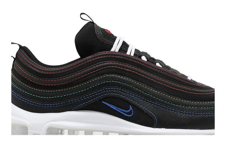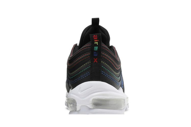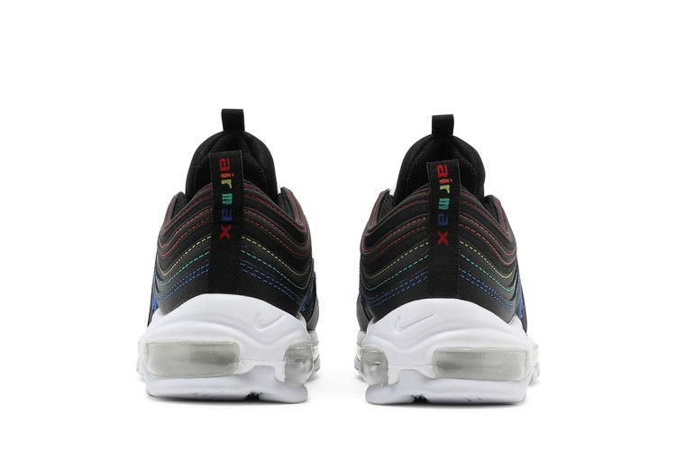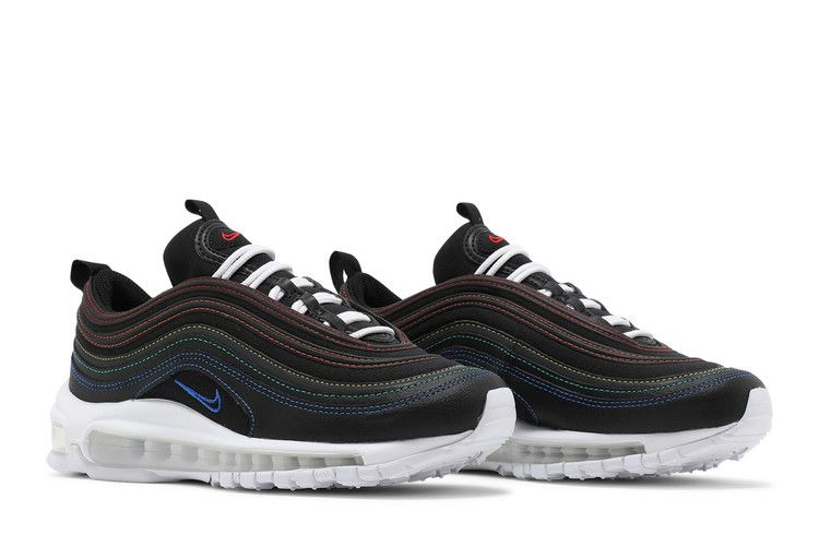 Женские кроссовки Nike Air Max 97 "Black" отличаются уникальным дизайном, который подчеркивают накладки, вдохновленные водной рябью. Верхняя часть кроссовок выполнена из черного текстиля со светоотражающими накладками, очерченными призматической гаммой контрастных цветов. Тема смешанных цветов повторяется на брендинге Air Max, украшающем тесьму на пятке. Кроссовки установлены на контрастную белую полиуретановую промежуточную подошву, оснащенную видимым блоком Max Air, который проходит по всей длине резиновой подошвы.