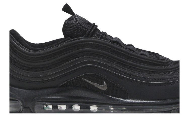 Дизайнеры Nike выбрали темную расцветку Nike Wmns Air Max 97 'Triple Black', сумев скрыть 3M-отражающие элементы силуэта. Однако почти все остальные элементы OG-стиля остались прежними. Верхняя часть начинается с черной сетки на язычке и традиционных волнистых накладок из кожи. Цвет сохраняется от верха до низа, за исключением чуть более светлого брендинга на боковой части, пятке, язычке и стельке.