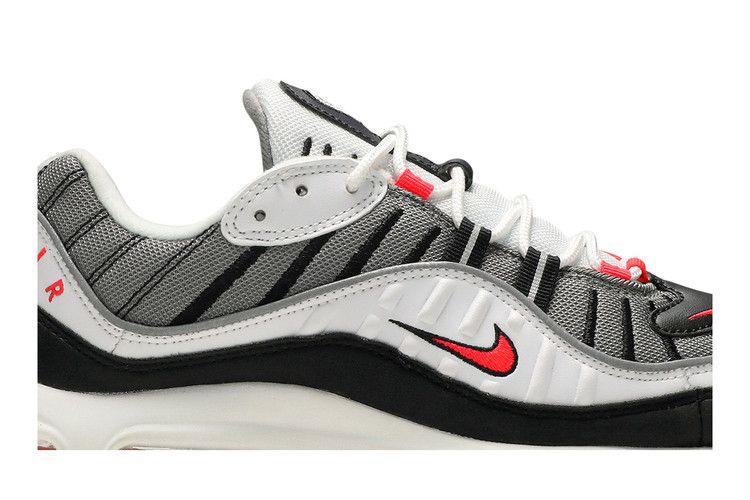 Эксклюзивная женская модель Air Max 98 "Solar Red", выпущенная в середине 2018 года, имеет те же фирменные элементы, что и ее предшественница конца 90-х годов, включая нетрадиционные шнурки, светоотражающую отделку и прозрачную подошву. Изогнутые слои подчеркнуты белым, черным и серебристым светоотражающими элементами, а такие детали, как логотипы Nike Swooshes, петли для шнурков и видимая часть подошвы, выполнены в красном цвете.