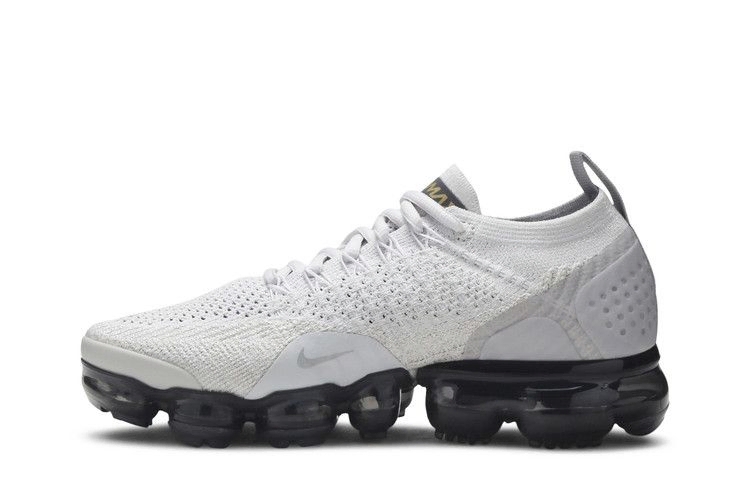 Женские Air VaporMax 2 "Metallic Gold" - это изысканная расцветка с легким блеском. Дышащий верх из материала Flyknit выполнен в дополняющих друг друга оттенках Vast Grey и Pure Platinum и украшен металлическим золотом на фирменном логотипе Swoosh и язычке. Простой дизайн верха поддерживается блоком VaporMax в полупрозрачном темно-сером цвете.