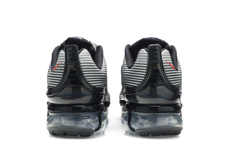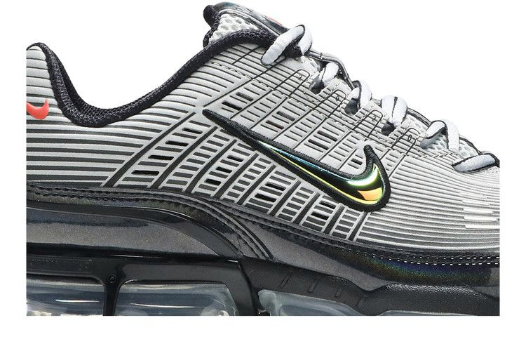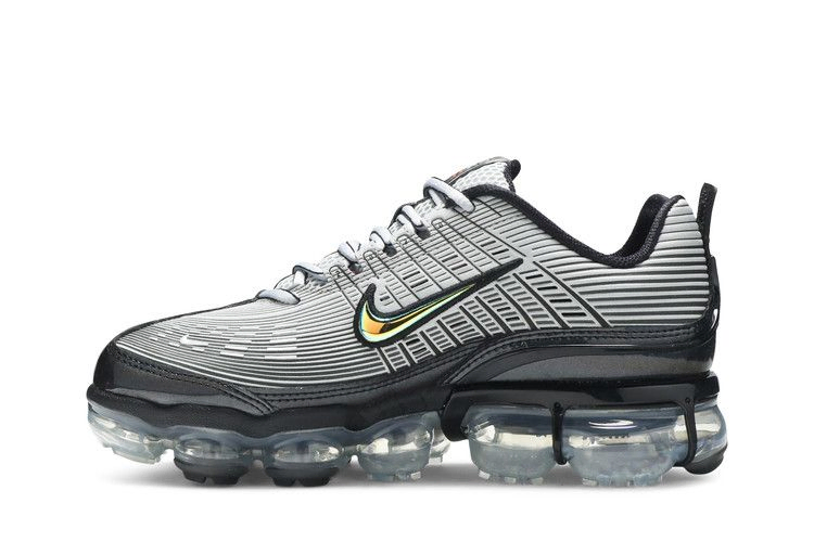 В женских Air VaporMax 360 "Grey" полосатый верх Air Max 360 помещен на полупрозрачную платформу VaporMax, обеспечивающую мягкую амортизацию. Нейтрально-серый цвет верха контрастирует с переливающимся Swoosh и брызговиком из черной лакированной кожи, на который также нанесен тонкий переливающийся эффект. Оранжевый миниатюрный Swoosh на боковой пятке добавляет контрастный цвет.