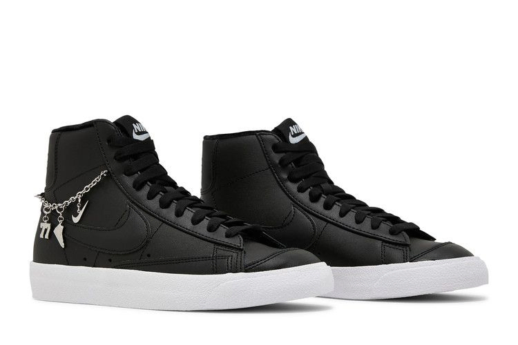 Женские Blazer Mid '77 LX "Lucky Charms Black" от Nike украшают винтажные кроссовки с фурнитурой. Монохромная черная отделка кожаного верха, подкладка из плюшевого бархата и серебристый брендинг Nike на тканом язычке и язычке пятки. По воротнику проходит съемная серебристая цепочка с трио серебристых подвесок. Кроссовки опираются на текстурированную белую резиновую подошву и поддерживаются подошвой из резины, сцепляющейся с поверхностью в виде елочки.