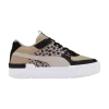 Женские кроссовки PUMA Cali Sport 'Wildcats' выполнены из смешанных материалов: бежевая кожаная основа с меховыми панелями с животным принтом и белая замшевая полоса Formstrip. Золотистые металлические детали украшают люверсы и элементы брендинга, включая логотип PUMA в виде прыгающей кошки на язычке пятки. Силуэт в ретро-стиле опирается на приподнятую платформенную подошву, усиленную прочной резиновой подошвой.