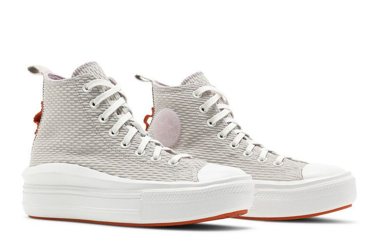 Женские кеды Converse Chuck Taylor All Star Move High 'Future Utility' выполнены из тканого текстиля кремового цвета. Тонкий розовый оттенок присутствует на внутренней подкладке и полупрозрачной нашивке All Star на медиальной лодыжке, а на пятке выделяется ярким оранжевым цветом вставка из тесьмы. Модель установлена на легкую платформенную подошву чистого белого цвета. Подошва из оранжевой резины с традиционным ромбовидным рисунком для сцепления с поверхностью, проверенным временем.