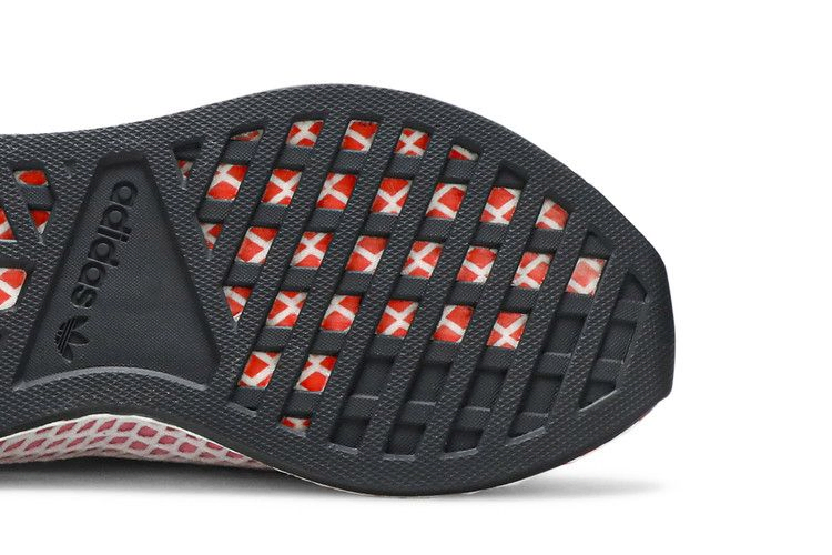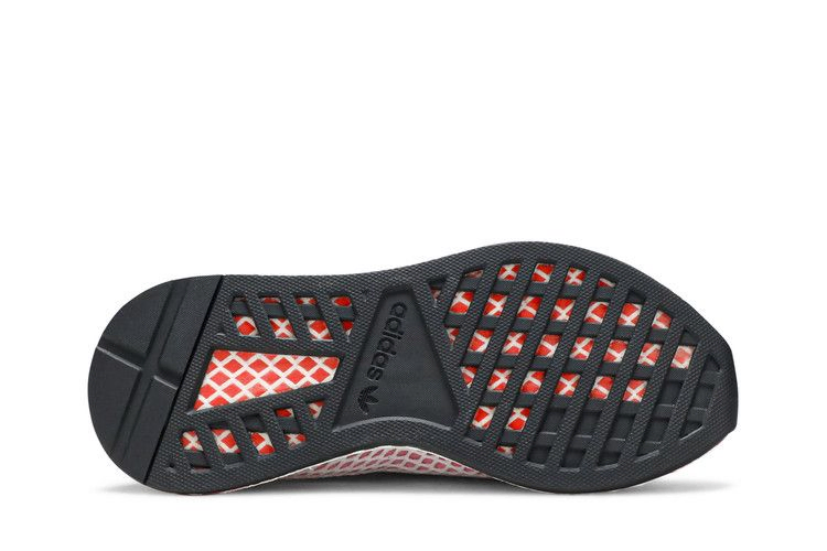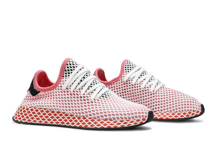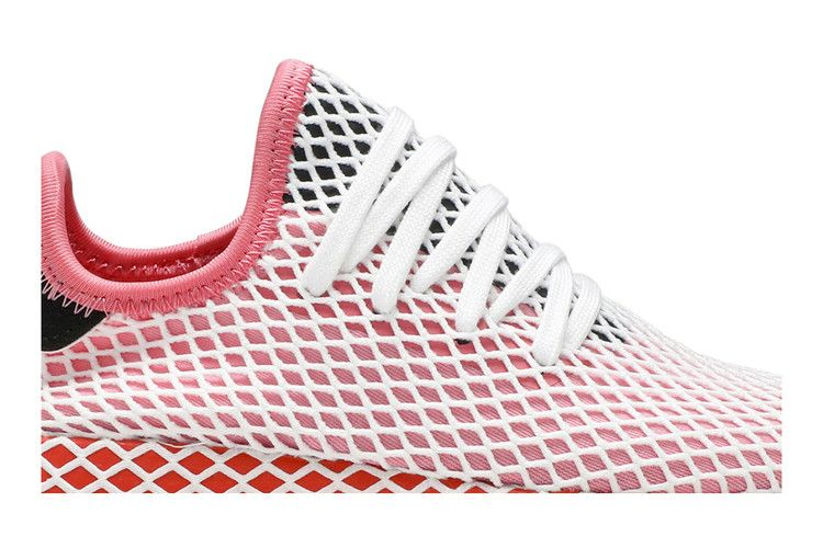 Верхняя часть adidas Deerupt полностью покрыта сеткой, вплоть до межподошвы. Кроссовки имеют носочную конструкцию и подкладку OrthoLite. Перекрестный рисунок сетки покрывает верхнюю часть Chalk Pink и простирается до самой нижней части промежуточной подошвы Bold Orange. Фирменная кожаная панель на пятке сплошного черного цвета выделяется среди сетчатой отделки.