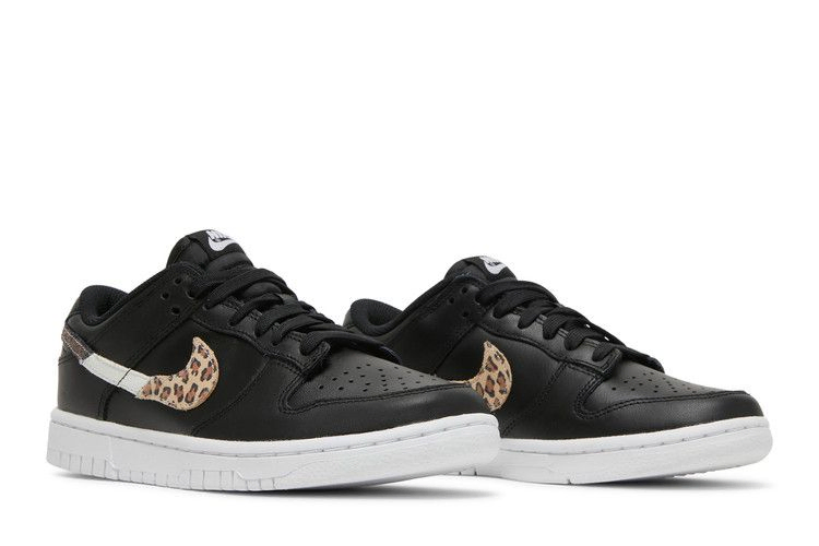 Женские кроссовки Nike Dunk Low SE "Primal Black", выпущенные в одной из трех расцветок, входящих в пакет "Animal Swoosh", имеют верх из гладкой черной кожи с сегментированным Swoosh в трех вариантах отделки: леопардовый принт, серая змеиная кожа и потрескавшаяся бронза. Дополнительные элементы брендинга включают вышитый знак Nike на язычке пятки и тканую бирку Nike на нейлоновом язычке с легкой подкладкой. Низкопрофильный силуэт стоит на белой резиновой подошве.