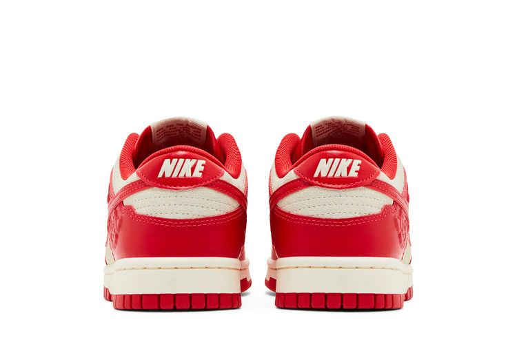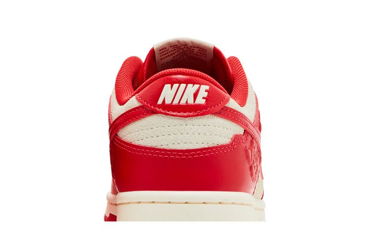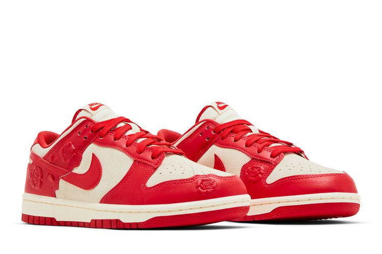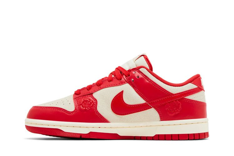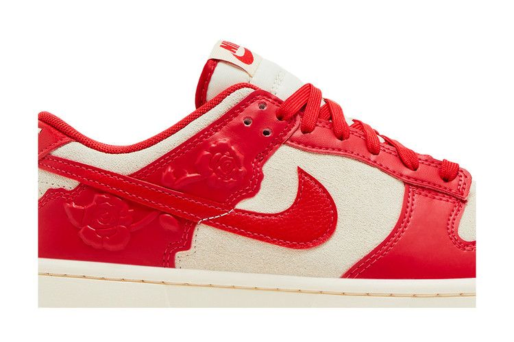 Женские кроссовки Nike Dunk Low "Roses" с замшевым верхом цвета кокосового молока контрастируют с накладками цвета University Red, украшенными тиснеными розами на носке, медиальной стороне передней части стопы и боковой части пятки. На язычке из воздухопроницаемого нейлона красуется тканая бирка Nike, а вышитый знак Nike украшает кожаный задник. Винтажная межподошва выполнена в белом цвете, а подошва подкреплена алой резиной.
