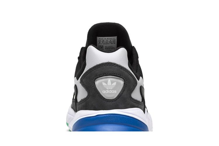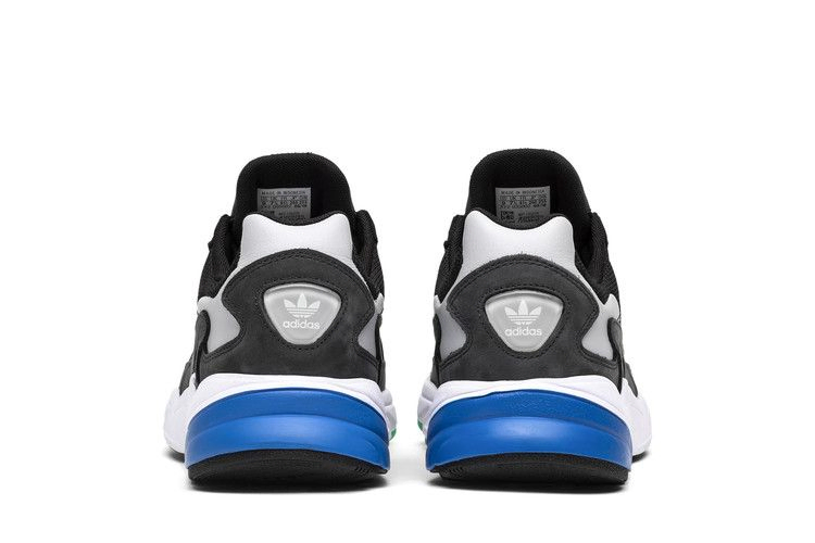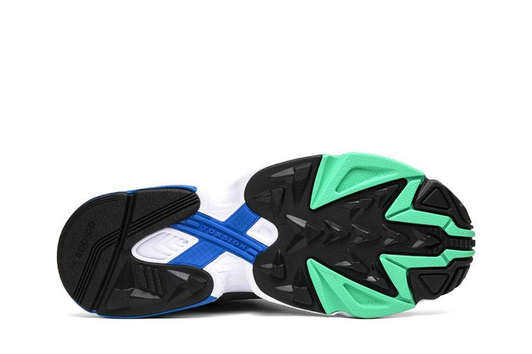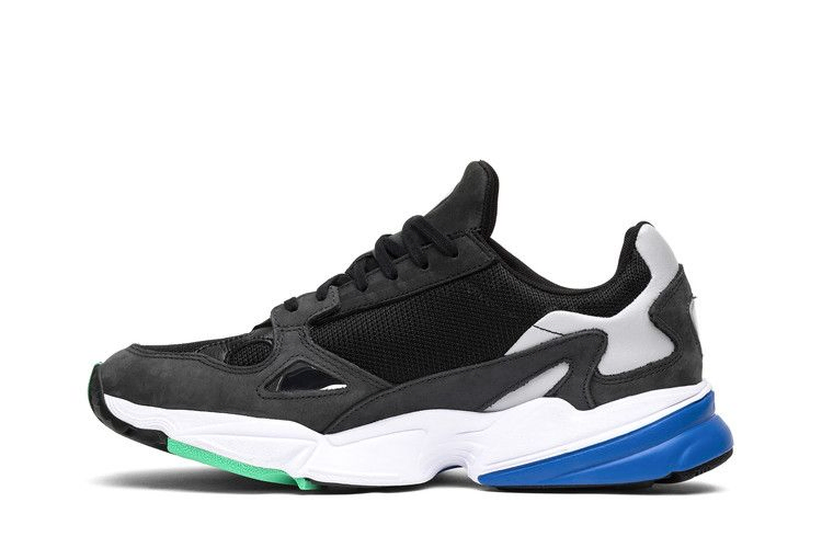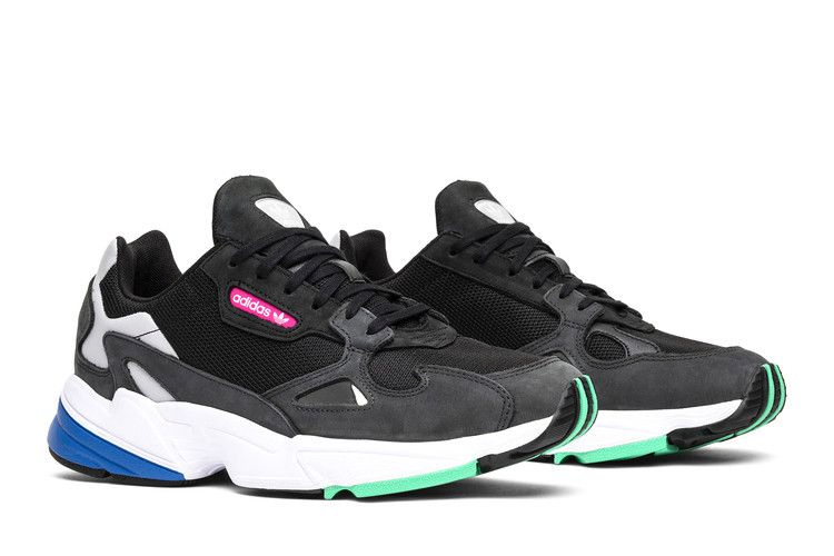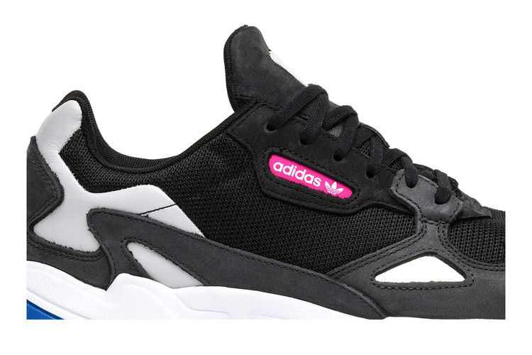 adidas использовал свой обширный архив 90-х годов для создания женских эксклюзивов Falcon - силуэта, выполненного из традиционных материалов. В этой модели, выпущенной в августе 2018 года, верхняя часть выполнена из черной сетки и темно-серой замши, а подошва из EVA оснащена системой adidas Torsion для устойчивости стопы. Нейтральная палитра нарушена яркими вкраплениями на стельке и подошве.