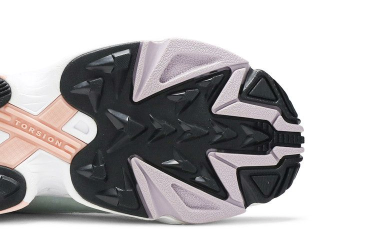 Женские Falcon 'Raw White' акцентируют нейтральную сетчатую основу кроссовок нежными пастельными оттенками, представленными накладками на пятке и четверти в цветах "вымытый тил" и "Trace Pink". Легкая амортизация обеспечивается скульптурной промежуточной подошвой из ЭВА, стабилизированной торсионной балкой adidas, встроенной в резиновую подошву. Логотип в виде трилистника на язычке, пятке и заднике придает ностальгическую эстетику 90-х.