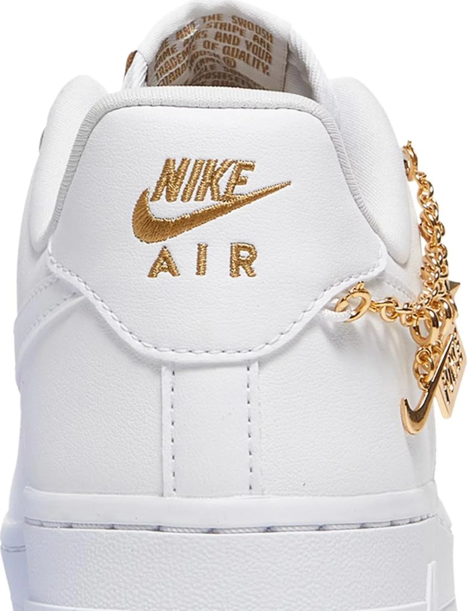 Выпущенные в рамках пакета "Lucky Charms", женские кроссовки Wmns Nike Air Force 1 '07 LX Lucky Charms добавляют декоративную фурнитуру к ретро-обуви. Низкие кроссовки имеют кожаный верх белого цвета, подкладку из мягкого текстиля и съемную золотую цепочку, украшенную различными подвесками Nike. Монохромный дизайн кроссовок прерывается надписью Nike, вышитой золотым шрифтом на язычке пятки. Логотип Nike Air золотого цвета украшает тканый язычок. Сплошная подошва из белой резины с вмонтированным блоком подошвы Air в пятке поддерживает низкий верх.- Цвета: White/White/Metallic Gold/Flat Gold