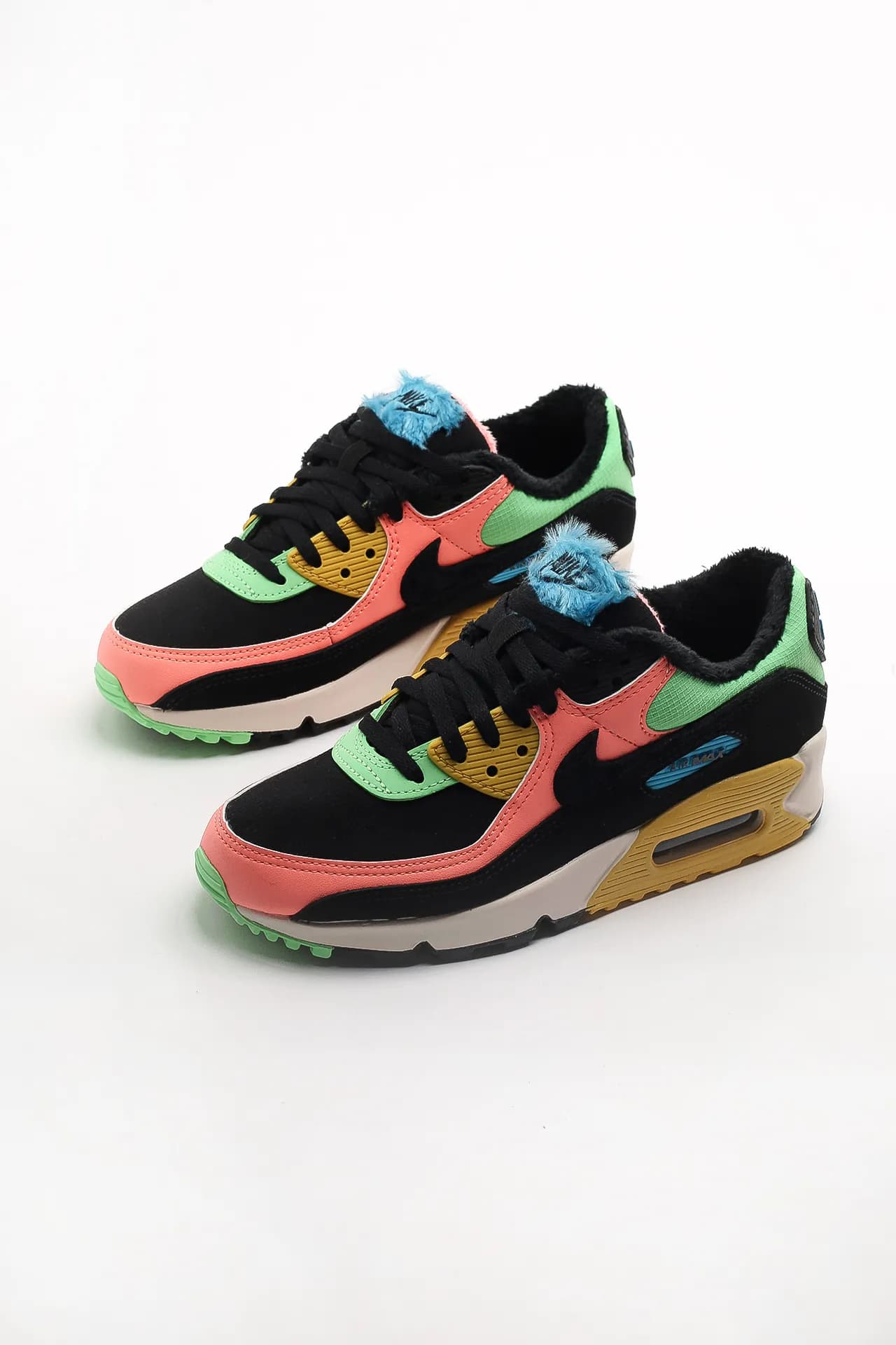 Модель Nike Air Max 90 "Fur Multi-Color" обновляет винтажные беговые кроссовки Тинкера Хэтфилда с помощью многоцветной композиции на верхней части, включающей черный текстиль на носке, розовую кожаную накладку и лаймово-зеленый текстиль вокруг воротника. Брызговик из черной кожи дополнен соответствующим черным Swoosh, покрытым меховой текстурой, которая повторяется на язычке и внутренней подкладке. Тускло-золотистая отделка нанесена на клин мидсоли, в котором расположен фирменный блок Max Air.