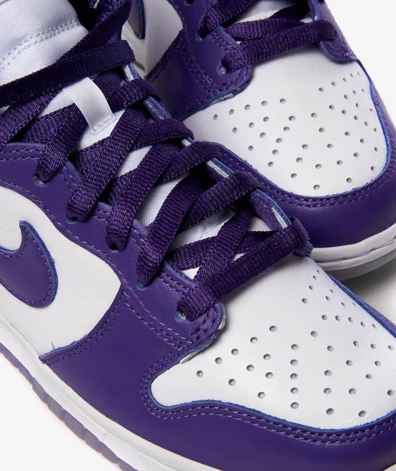 Поклонникам Nike Dunk High есть что отпраздновать в 2020 году, так как классическая баскетбольная модель вернулась на первый план. Зимой 2020 года была представлена первая эксклюзивная женская модель Nike Dunk High Varsity Purple (W). Этот выпуск вдохновлен эксклюзивной японской версией City Attack Dunk High, выпущенной в 1999 году.- Цвета: White/Varsity Purple