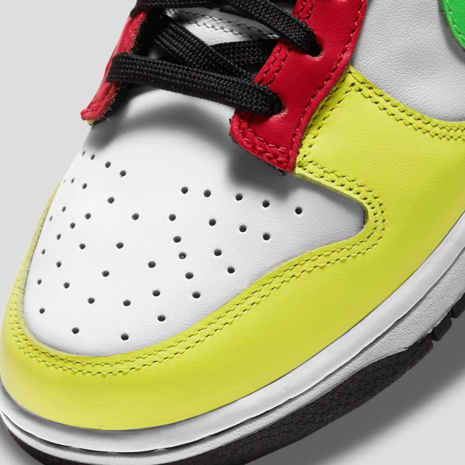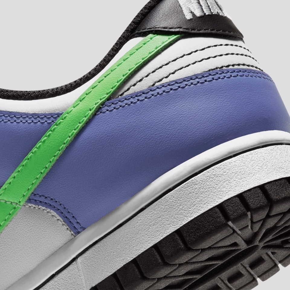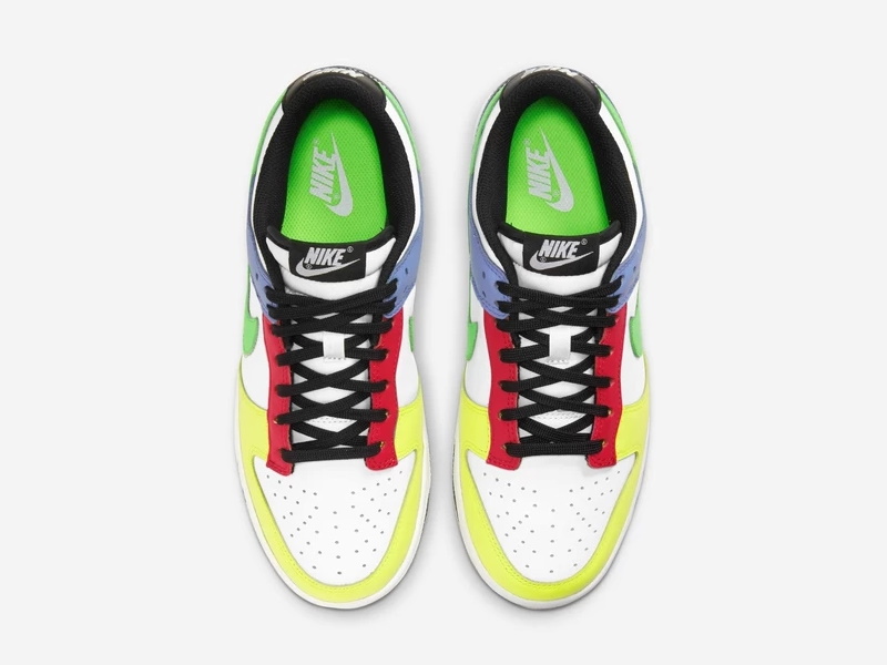 Женские кроссовки Nike Dunk Low 'Green Strike' отличаются дизайном с цветовыми блоками, который отсылает к корням силуэта 80-х годов. Примитивная 8-битная компьютерная графика той эпохи послужила источником вдохновения для яркой палитры кроссовок, которая сочетает в себе белую кожаную основу с желтой накладкой на переднюю часть стопы, салатовый логотип Swoosh. Контрастные черные вставки дополняют тканый язычок и язычок на пятке, отмеченные классическим логотипом Nike.- Цвет: Green Strike/Ember Glow/Vintage Yellow/Sapphire