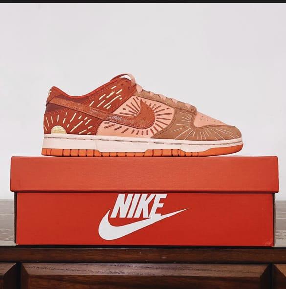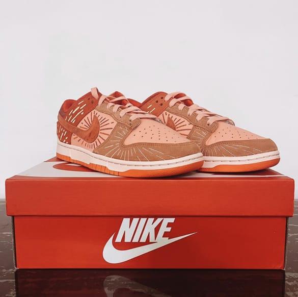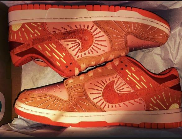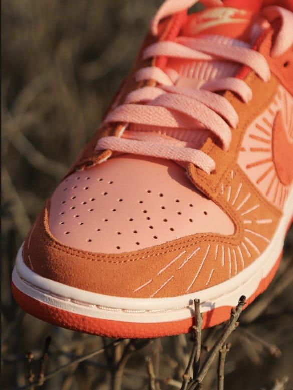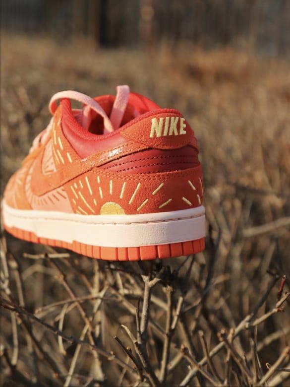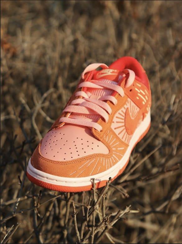 Женские кроссовки Nike Dunk Low "Winter Solstice" имеют уникальный дизайн, напоминающий о низковисящем солнце, которое сопровождает зимние месяцы. Лучистые линии вышиты по всему верху, основу которого составляет розовая кожа с замшевыми накладками оранжевого и малинового цветов. Последняя оборачивается вокруг пятки желтой графикой полусолнца с контрастной желтой вышивкой. Надпись "12.21.12" изображена на язычке правой модели и на носочной части левой, что указывает на официальное начало зимнего солнцестояния в 2021 году. Низкий верх опирается на промежуточную подошву розового цвета, под ногами ярко-красная резиновая подошва.- Цвет: Team Orange/Orange/Crimson Bliss