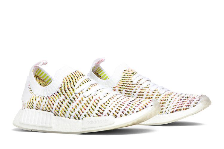 Модель NMD_R1 Primeknit изготовлена из пряжи adidas Space-Age, которая была погружена в различные красители для создания характерного многоцветного узора на верхе Primeknit. Модель имеет носочную конструкцию, межподошву Boost и стабилизаторы межподошвы, а также резиновую подошву с переплетением.