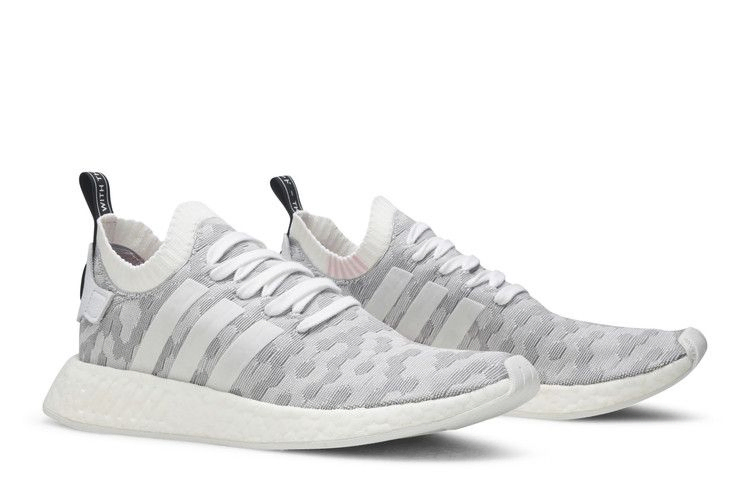 NMD_R2 Primeknit в цвете Footwear White, Core Black была выпущена на мировой рынок в июле 2017 года. Эта женская модель включает в себя бесшовный верх из материала primeknit для максимальной гибкости и промежуточную подошву Boost. Верхняя часть обуви украшена графическим рисунком, а пятка - белой кожаной нашивкой и контрастным черным язычком, украшенным брендингом NMD. На медиальной части кроссовка расположена розовая пробка из вспененного материала, а на трикотажном воротнике лодыжки - розовая деталь.