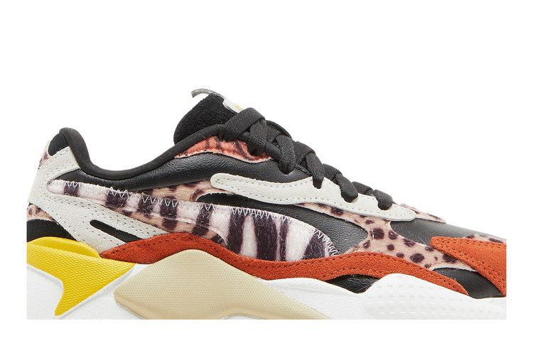 Женские PUMA RS-X3 "Black Rust", выпущенные в рамках коллекции "Wildcats", имеют эклектичную конструкцию, состоящую из черной кожаной основы с замшевыми и меховыми накладками с животными принтами, включая полосатую полоску PUMA Formstrip на боковых панелях кроссовок. Привлекательная эстетика усиливается угловатыми элементами TPU, встроенными в боковые стенки объемной пенополиуретановой подошвы, которая поддерживается трехцветной резиновой подошвой.