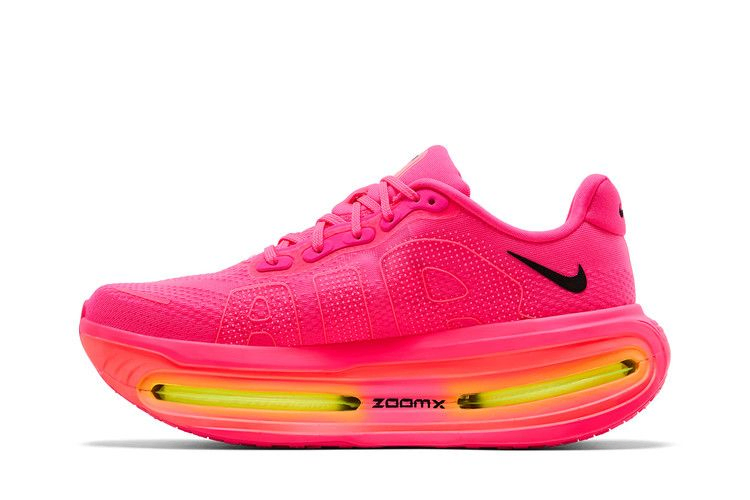 Женские кроссовки Nike Vomero Premium "Hyper Pink" представляют собой привлекательный вариант беговой обуви, предназначенной для ежедневных тренировок. Верхняя часть из сетки выполнена в горячем розовом цвете и украшена черной надписью Swoosh с крупным брендингом 'AIR'. Легкая конструкция располагается на розовой межподошве из пеноматериала ZoomX высотой 55 мм и оснащена желтыми воздушными блоками Zoom Air, стратегически расположенными в носочной и пяточной частях. Подошва с вафельным рисунком, выполненная из износостойкой резины, обеспечивает надежное сцепление.