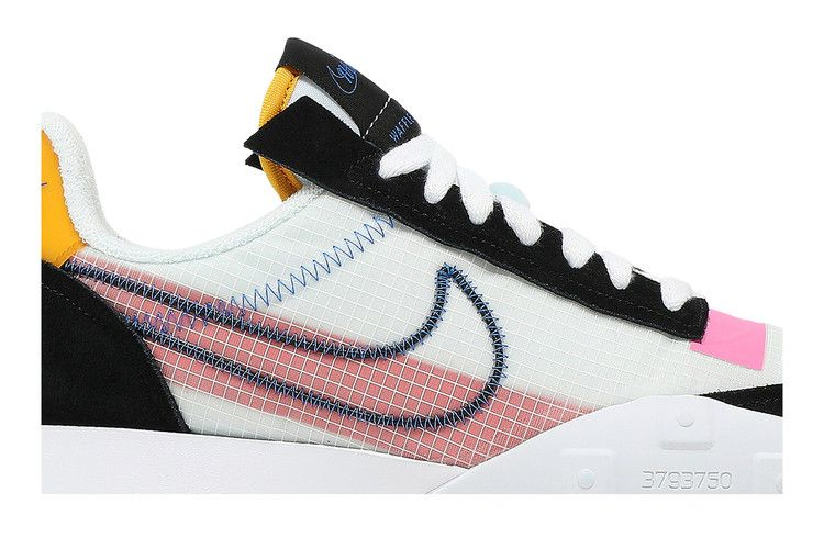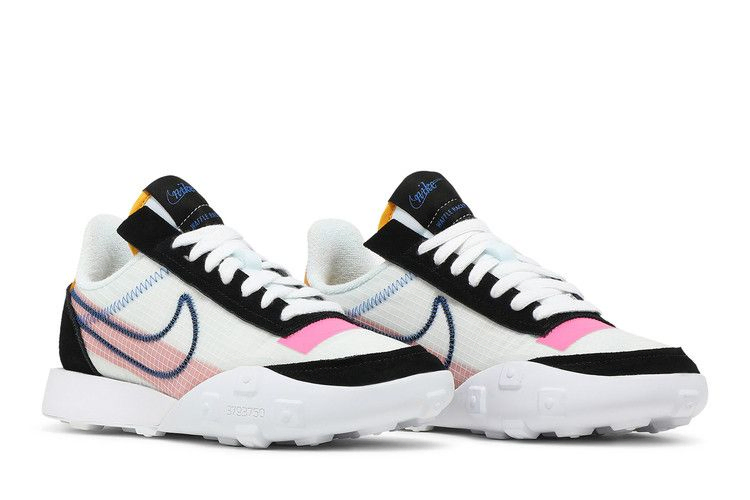 Женские кроссовки Nike Waffle Racer 2X "White Chile Red" с увеличенными деталями и современной эстетикой DIY в силуэте, вдохновленном культовыми кроссовками 70-х годов. Верхняя часть выполнена из полупрозрачного белого текстиля, украшенного зигзагообразной строчкой и вышитым логотипом Swoosh. Контрастные черные вставки расположены на веке, тканом язычке и усиленных накладках на носке и пятке. Подошва с преувеличенным вафельным рисунком на передней части подошвы обеспечивает дополнительное сцепление с поверхностью.